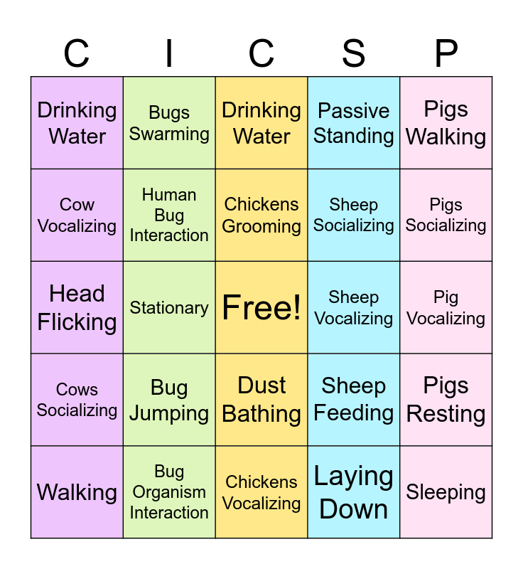 This bingo card has a free space and 39 words: Tail flicking, Bug Flying, Wing Flapping, Sheep Feeding, Pigs Resting, Cows Socializing, Stationary, Feather Pecking, Sheep Vocalizing, Pig Vocalizing, Cow Vocalizing, Bugs Swarming, Sheep Nursing, Pigs Socializing, Head Flicking, Bug Jumping, Dust Bathing, Passive Standing, Pigs Standing, Walking, Human Bug Interaction, Chickens Grooming, Laying Down, Pigs Walking, Stationary Feeding, Bug Organism Interaction, Chickens Vocalizing, Drinking Water, Eating, Drinking Water, You found a Bug. Good Job., Chickens Socializing, Sheep Socializing, Sleeping, Cows Interaction with Calf, Bug Walking, Drinking Water, Sheep Walking and Drinking Water.