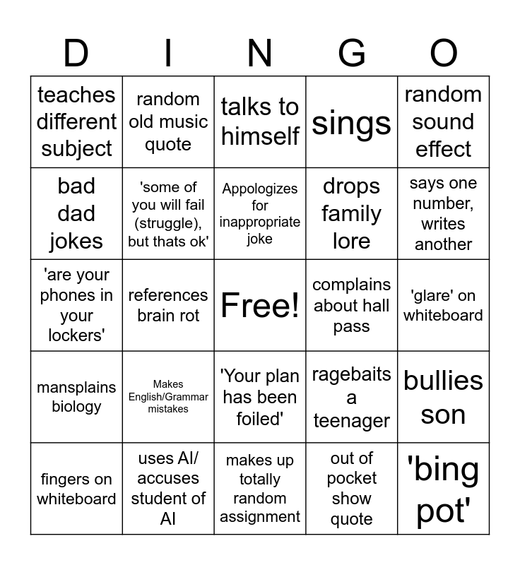 This bingo card has a free space and 24 words: Makes English/Grammar mistakes, uses AI/ accuses student of AI, Appologizes for inappropriate joke, fingers on whiteboard, random sound effect, teaches different subject, bad dad jokes, random old music quote, complains about hall pass, 'Your plan has been foiled', drops family lore, 'are your phones in your lockers', ragebaits a teenager, bullies son, 'some of you will fail (struggle), but thats ok', out of pocket show quote, 'glare' on whiteboard, talks to himself, says one number, writes another, references brain rot, 'bing pot', mansplains biology, sings and makes up totally random assignment.