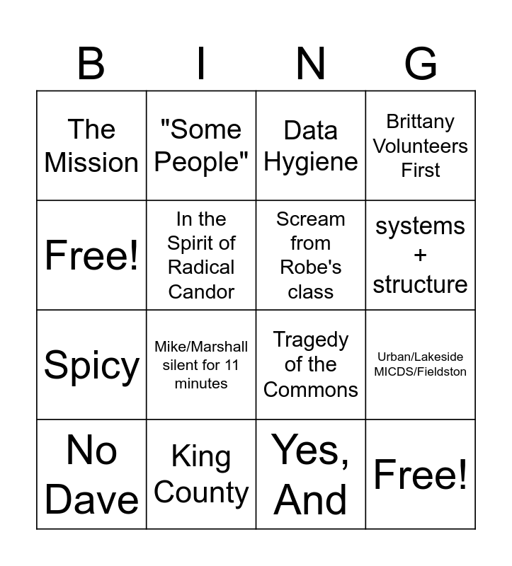 This bingo card has 16 words: King County, Urban/Lakeside MICDS/Fieldston, Data Hygiene, The Mission, Spicy, "Some People", Tragedy of the Commons, Yes, And, Free!, In the Spirit of Radical Candor, No Dave, Brittany Volunteers First, Mike/Marshall silent for 11 minutes, systems + structure, Scream from Robe's class and Free!.