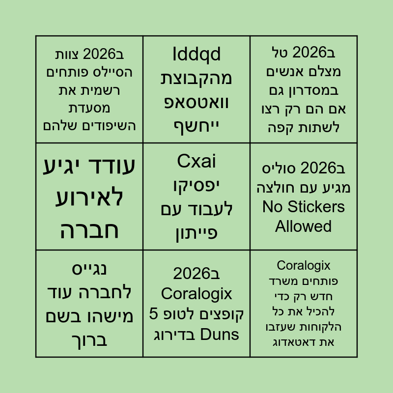 This bingo card has 31 words: ונטורה יבקש שלא יכבו עליו את האורות, יוני ימצא ברווזון שמתחבא אצלו בחדר, מישהו מישראל יעשה רילוקיישן לבוסטון, צוות פייננס ירדוף אחרי אנשים שיעלו קבלות למש, ב2026 צוות הסיילס פותחים רשמית את מסעדת השיפודים שלהם, ב2026 טל מצלם אנשים במסדרון גם אם הם רק רצו לשתות קפה, נגייס לחברה עוד מישהו בשם ברוך, נגייס את איהאב לתפקיד קבוע בקורלוג׳יקס, לירון הישנה עדיין תבוא לאירועי חברה, יהיה ראש צוות חדש לapm, נמרוד יגייס עוד עובד בשם אוריה, פרודקט יעבדו על תכנית לexplore v3 ואז על explore v4 וכן הלאה, אריאל יגיד בסיכום שנה שעוד שלוש שנים ipo, איליה יקבל את המתח שהוא חולם עליו, המכונת אספרסו תקבל עדכון ותפסיק לבקש לרוקן את המים לפני השימוש, אסף ונטרוה פותח קבוצת וואטסאפ מדלברים ונהנים עם עדכונים עד השעות הקטנות של הלילה, זוהר מוציא טופס 4 למשרד שלו ומוסיף מרפסת, הראל בשתפ עם אמזון מריץ ביולי את הDataPrime Day חגיגת מבצעים של datasets, יוני מתקין מדיח במשרד שלו לכוסות אספרסו, Olly בעזרת השם מתכנן להתחתן עם Ollivia ולהרחיב את המשפחה, Cxai יפסיקו לעבוד עם פייתון, רון יישב במשרד או ישב באופן כללי, יעל תצבע את השיער לחום, Iddqd מהקבוצת וואטסאפ ייחשף, Coralogix פותחים משרד חדש רק כדי להכיל את כל הלקוחות שעזבו את דאטאדוג, ב2026 סוליס מגיע עם חולצה No Stickers Allowed, עודד יגיע לאירוע חברה, תוכנית חבר מביא חבר מתרחבת לדוד מביא דודה, ב2026 הפיצר החדש מעלית מסתובבת בלובי עם כפתור Undo, ב2026 Coralogix קופצים לטופ 5 בדירוג Duns and התמונה הרשמית של אריאל ויוני נשארת אותה אחת הנוסטלגיה זה הBrand.