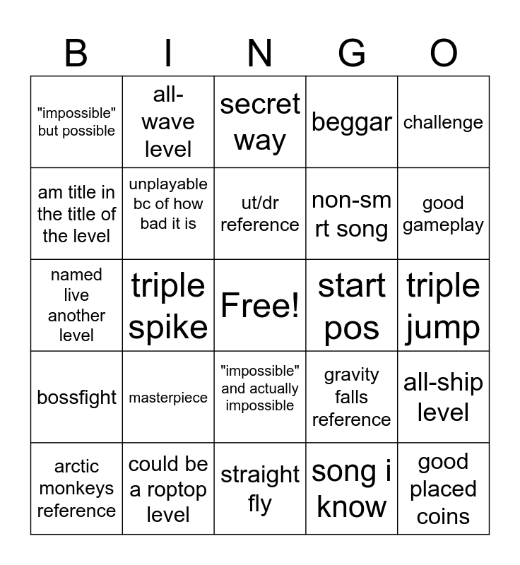 This bingo card has a free space and 24 words: masterpiece, could be a roptop level, ut/dr reference, arctic monkeys reference, challenge, "impossible" but possible, am title in the title of the level, all-wave level, start pos, "impossible" and actually impossible, non-sm rt song, named live another level, gravity falls reference, all-ship level, unplayable bc of how bad it is, song i know, triple jump, secret way, good gameplay, triple spike, good placed coins, bossfight, beggar and straight fly.
