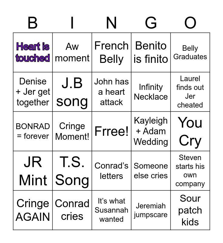 This bingo card has a free space and 24 words: T.S. Song, Conrad cries, John has a heart attack, Cringe AGAIN, Belly Graduates, Heart is touched, Denise + Jer get together, Aw moment, Kayleigh + Adam Wedding, Conrad’s letters, Infinity Necklace, BONRAD = forever, Someone else cries, Steven starts his own company, J.B song, Jeremiah jumpscare, You Cry, French Belly, Laurel finds out Jer cheated, Cringe Moment!, Sour patch kids, JR Mint, Benito is finito and It’s what Susannah wanted.