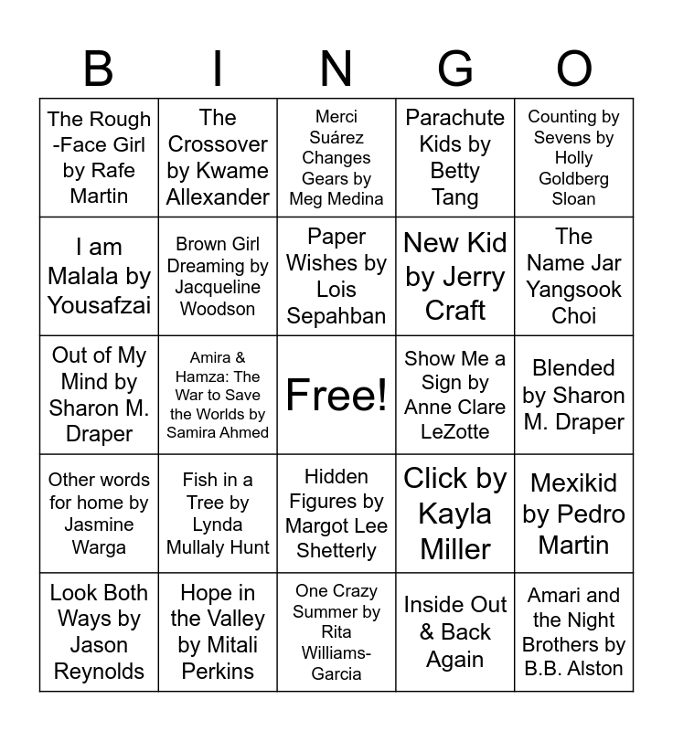 This bingo card has a free space and 27 words: Click by Kayla Miller, Esperanza Rising by Pam Muñoz Ryan, New Kid by Jerry Craft, One Crazy Summer by Rita Williams-Garcia, I am Malala by Yousafzai, Merci Suárez Changes Gears by Meg Medina, The Crossover by Kwame Allexander, Other words for home by Jasmine Warga, Show Me a Sign by Anne Clare LeZotte, Mexikid by Pedro Martin, Out of My Mind by Sharon M. Draper, Parachute Kids by Betty Tang, Look Both Ways by Jason Reynolds, Hope in the Valley by Mitali Perkins, The Name Jar Yangsook Choi, Wonder by R.J. Palacio, Brown Girl Dreaming by Jacqueline Woodson, Paper Wishes by Lois Sepahban, Fish in a Tree by Lynda Mullaly Hunt, The Rough -Face Girl by Rafe Martin, Blended by Sharon M. Draper, Inside Out & Back Again, Amira & Hamza: The War to Save the Worlds by Samira Ahmed, Amari and the Night Brothers by B.B. Alston, Hidden Figures by Margot Lee Shetterly, Counting by Sevens by Holly Goldberg Sloan and The Magic Misfits by Neil Patrick Harris.