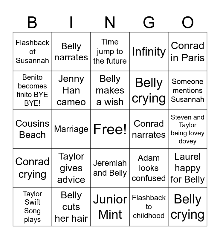 This bingo card has a free space and 24 words: Taylor gives advice, Belly cuts her hair, Belly makes a wish, Taylor Swift Song plays, Conrad in Paris, Flashback of Susannah, Benito becomes finito BYE BYE!, Belly narrates, Conrad narrates, Jeremiah and Belly, Belly crying, Cousins Beach, Adam looks confused, Laurel happy for Belly, Jenny Han cameo, Flashback to childhood, Steven and Taylor being lovey dovey, Time jump to the future, Someone mentions Susannah, Marriage, Belly crying, Conrad crying, Infinity and Junior Mint.
