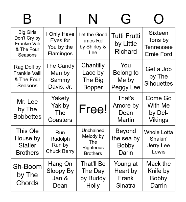 This bingo card has a free space and 29 words: Sh-Boom by The Chords, Stand by Me by Ben E. King, Yakety Yak by The Coasters, Shake Rattle and Roll by Big Joe Turner, Big Girls Don't Cry by Frankie Vali & The Four Seasons, Let the Good Times Roll by Shirley & Lee, The Candy Man by Sammy Davis, Jr., Run Rudolph Run by Chuck Berry, That's Amore by Dean Martin, Hang On Sloopy By Jan & Dean, Come Go With Me by Del-Vikings, Mack the Knife by Bobby Darrin, That'll Be The Day by Buddy Holly, Young at Heart by Frank Sinatra, Get a Job by The Sihouettes, Teenager in love by Dion & the Belmonts, Unchained Melody by The Righteous Brothers, This Ole House by Statler Brothers, Sixteen Tons by Tennessee Ernie Ford, Mr. Lee by The Bobbettes, Beyond the sea by Bobby Darin, Who's Sorry Now by Connie Francis, You Belong to Me by Peggy Lee, Rag Doll by Frankie Valli & The Four Seasons, Tutti Frutti by Little Richard, I Only Have Eyes for You by the Flamingos, Whole Lotta Shakin' Jerry Lee Lewis, Chantilly Lace by The Big Bopper and Long Tall Sally by Little Richard.