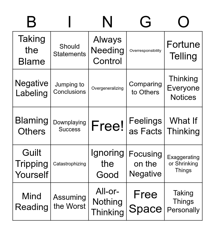 This bingo card has a free space and 25 words: Catastrophizing, All-or-Nothing Thinking, Overgeneralizing, Mind Reading, Fortune Telling, Taking the Blame, Negative Labeling, Should Statements, Feelings as Facts, Ignoring the Good, Comparing to Others, Blaming Others, Focusing on the Negative, Exaggerating or Shrinking Things, Jumping to Conclusions, Perfectionism, What If Thinking, Always Needing Control, Thinking Everyone Notices, Downplaying Success, Taking Things Personally, Assuming the Worst, Guilt Tripping Yourself, Overresponsibility and Free Space.