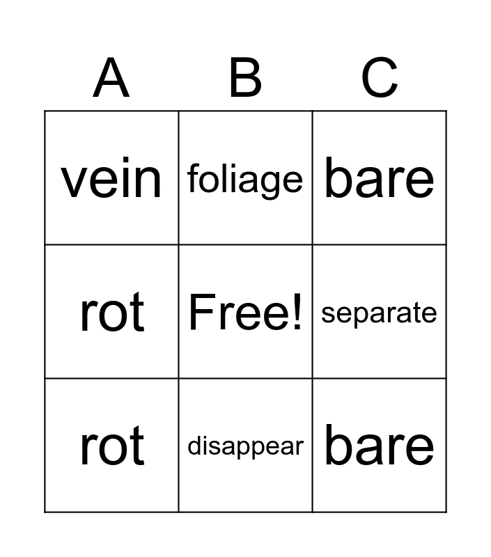 This bingo card has a free space and 8 words: separate, bare, foliage, rot, vein, bare, rot and disappear.