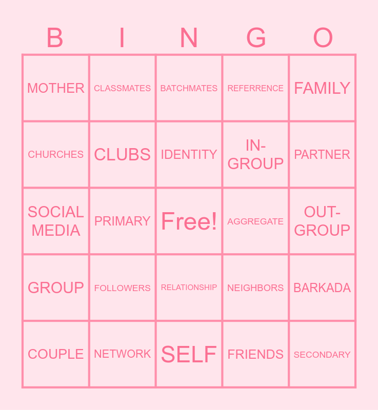 This bingo card has a free space and 25 words: GROUP, NETWORK, SELF, FRIENDS, FAMILY, MOTHER, CLASSMATES, BATCHMATES, AGGREGATE, BARKADA, CHURCHES, CLUBS, ORGANIZATIONS, NEIGHBORS, PARTNER, COUPLE, PRIMARY, IDENTITY, IN-GROUP, OUT-GROUP, SOCIAL MEDIA, FOLLOWERS, RELATIONSHIP, REFERRENCE and SECONDARY.