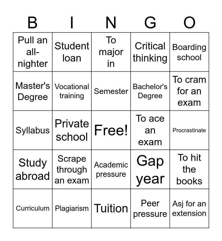 This bingo card has a free space and 36 words: Primary School, Secondary School, Higher education, Vocational training, Gap year, Study abroad, Semester, Co-ed school, Boarding school, State school, Private school, Critical thinking, Intensive course, To ace an exam, To cram for an exam, Pull an all-nighter, Pass with flying colors, Scrape through an exam, Asj for an extension, To major in, Procrastinate, To hit the books, Plagiarism, Curriculum, Tuition, Student loan, Syllabus, Scholarship, Bachelor's Degree, Master's Degree, PhD/Doctorate, Well-educated, Peer pressure, Academic pressure, Learning curve and Bookworm.