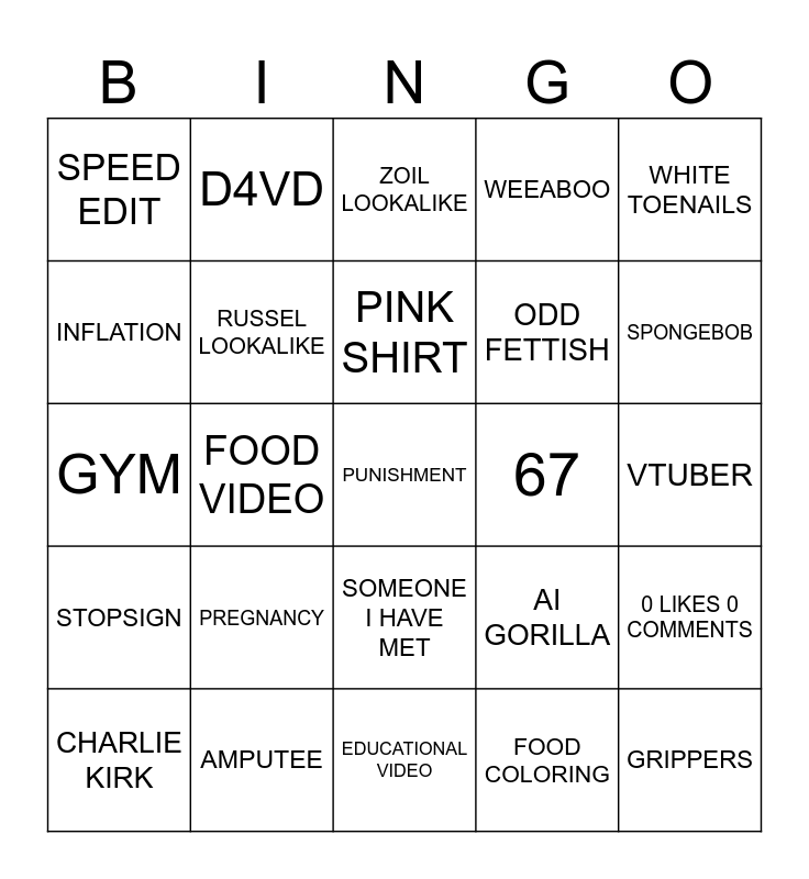 This bingo card has a free space and 24 words: PREGNANCY, AMPUTEE, PINK SHIRT, CHARLIE KIRK, WHITE TOENAILS, SPEED EDIT, INFLATION, D4VD, 67, SOMEONE I HAVE MET, ODD FETTISH, GYM, AI GORILLA, 0 LIKES 0 COMMENTS, RUSSEL LOOKALIKE, FOOD COLORING, VTUBER, ZOIL LOOKALIKE, SPONGEBOB, FOOD VIDEO, GRIPPERS, STOPSIGN, WEEABOO and EDUCATIONAL VIDEO.