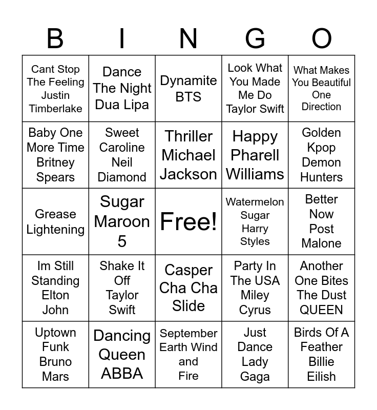 This bingo card has a free space and 24 words: Shake It Off Taylor Swift, Dancing Queen ABBA, Thriller Michael Jackson, Uptown Funk Bruno Mars, What Makes You Beautiful One Direction, Cant Stop The Feeling Justin Timberlake, Baby One More Time Britney Spears, Dance The Night Dua Lipa, Watermelon Sugar Harry Styles, Casper Cha Cha Slide, Happy Pharell Williams, Grease Lightening, Party In The USA Miley Cyrus, Another One Bites The Dust QUEEN, Sweet Caroline Neil Diamond, Just Dance Lady Gaga, Better Now Post Malone, Dynamite BTS, Golden Kpop Demon Hunters, Sugar Maroon 5, Birds Of A Feather Billie Eilish, Im Still Standing Elton John, Look What You Made Me Do Taylor Swift and September Earth Wind and Fire.