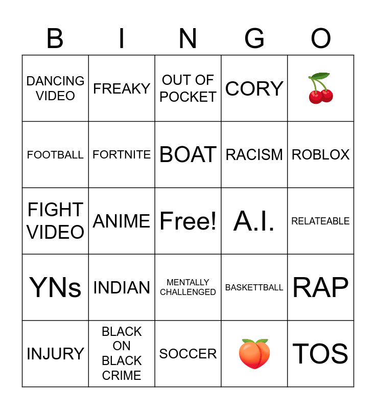 This bingo card has a free space and 24 words: INDIAN, BLACK ON BLACK CRIME, BOAT, INJURY, 🍒, DANCING VIDEO, FOOTBALL, FREAKY, A.I., MENTALLY CHALLENGED, RACISM, FIGHT VIDEO, BASKETTBALL, RAP, FORTNITE, 🍑, RELATEABLE, OUT OF POCKET, ROBLOX, ANIME, TOS, YNs, CORY and SOCCER.