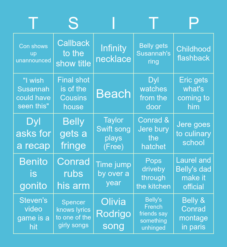 This bingo card has a free space and 37 words: Jeremiah & Denise, (Conrad) Fi**er's in Paris, Metaphor about summer, Final shot is of the Cousins house, Laurel and Belly's dad make it official, Conrad rubs his arm, Beach, Voiceover from Conrad, Childhood flashback, *brooding stares*, Belly gets a fringe, Belly gets Susannah's ring, Belly & Conrad montage in paris, Jere goes to culinary school, "I wish Susannah could have seen this", Benito is gonito, Steve & Taylor outrageous chemistry moment, Infinity necklace, Time jump by over a year, Conrad & Jere bury the hatchet, Con shows up unannounced, Eric gets what's coming to him, Steven's video game is a hit, Olivia Rodrigo song, Belly gets a bob, Belly's French friends say something unhinged, Callback to the show title, Belly is torn about going home, Truds is more invested than she lets on, Kate calls out a plot hole, Cfray leaves halfway through, Spencer knows lyrics to one of the girly songs, Dyl asks for a recap, Teesh asks if she is on one of the bingo cards, Pops driveby through the kitchen, Dyl watches from the door and “Periodt” - Kate’s response to something Belly says.