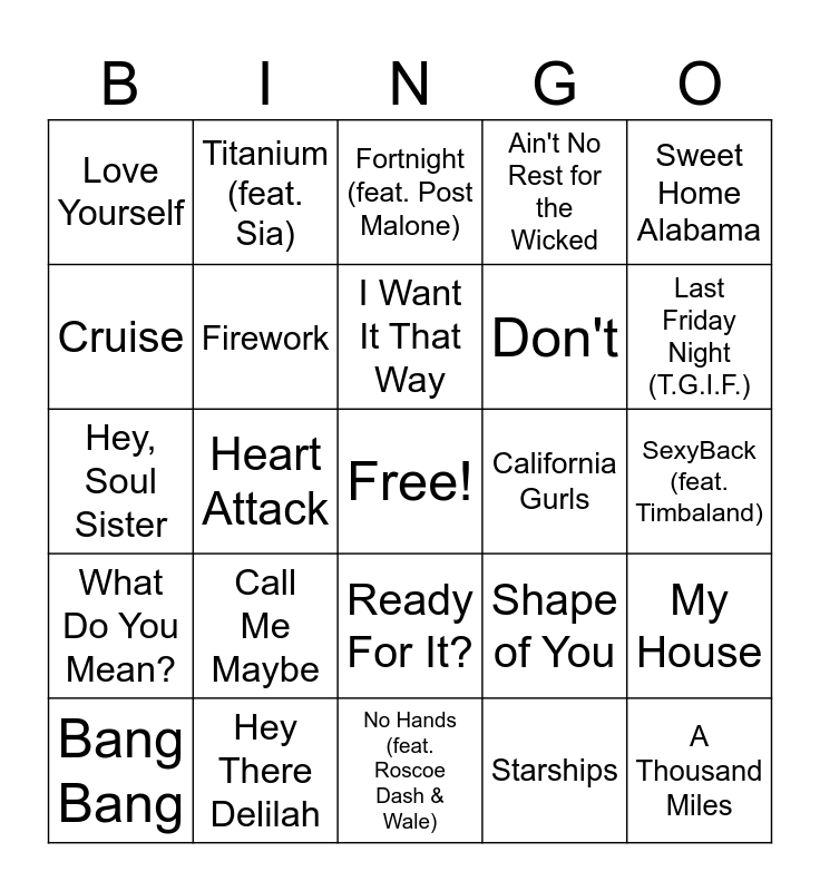 This bingo card has a free space and 79 words: Señorita, Sunflower - Spider-Man: Into the Spider-Verse, Fortnight (feat. Post Malone), Cruel Summer, Stacy's Mom, Jessie's Girl, Barbie Girl, Dancing Queen, I Want Candy, Uptown Funk (feat. Bruno Mars), Don't Worry Be Happy, Cake By The Ocean, Ain't No Rest for the Wicked, Love Yourself, Don't Stop Believin', Cruise, Thunder, Call Me Maybe, Party In The U.S.A., SexyBack (feat. Timbaland), Sweet Caroline, Sweet Home Alabama, Hey, Soul Sister, I Want It That Way, Firework, Wannabe, Roar, Counting Stars, All Star, Walking On Sunshine, Last Friday Night (T.G.I.F.), Wake Me Up Before You Go-Go, No Hands (feat. Roscoe Dash & Wale), Party Like A Rock Star E, Bang Bang, California Gurls, TiK ToK, What Makes You Beautiful, I Knew You Were Trouble., A Thousand Miles, Baby One More Time, Wrecking Ball, I'll Be There for You - Theme From "Friends", 24K Magic, Toxic, Titanium (feat. Sia), Just the Way You Are, You Belong With Me, Honey, I'm Good, Love Story, My House, Heart Attack, Shape of You, Bye Bye Bye, Problem, Mamma Mia, I Don't Wanna Live Forever, Scream & Shout, ME!, Ready For It?, Don't, Centuries, Ice Ice Baby, Stressed Out, Pumped Up Kicks, It Wasn't Me, Billie Jean, Heathens, September, What Do You Mean?, Hey There Delilah, Big Yellow Taxi, Shut Up and Dance, Dynamite, Teenage Dream, Starships, When Did You Get Hot?, Maroon and Mary's Song (Oh My My My).