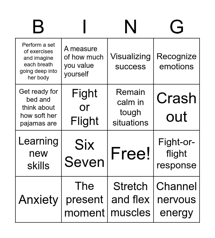 This bingo card has 22 words: The present moment, To help people handle difficult situations more easily, A measure of how much you value yourself, Practicing self-compassion, Fight or Flight, Remain calm in tough situations, Perform a set of exercises and imagine each breath going deep into her body, Visualizing success, Free!, Channel nervous energy, Learning new skills, Recognize emotions, Keep practicing, I can get better!, Breathe slowly and deeply, Stretch and flex muscles, I'll never be good enough!, Fight-or-flight response, Anxiety, Six Seven, Get ready for bed and think about how soft her pajamas are, Crash out and I suck.