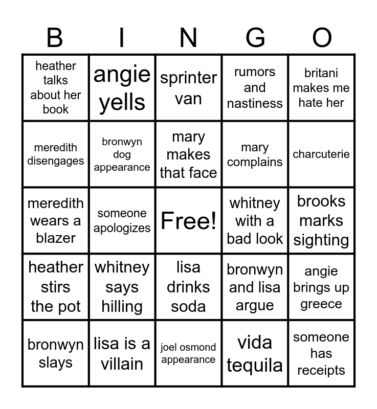This bingo card has a free space and 24 words: whitney says hilling, lisa is a villain, mary makes that face, bronwyn slays, britani makes me hate her, heather talks about her book, meredith disengages, angie yells, whitney with a bad look, lisa drinks soda, mary complains, meredith wears a blazer, bronwyn and lisa argue, angie brings up greece, bronwyn dog appearance, vida tequila, brooks marks sighting, sprinter van, charcuterie, someone apologizes, someone has receipts, heather stirs the pot, rumors and nastiness and joel osmond appearance.