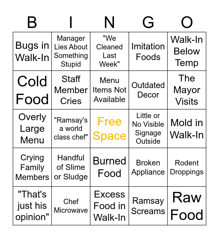 This bingo card has a free space and 24 words: Handful of Slime or Sludge, Chef Microwave, Menu Items Not Available, "That's just his opinion", Walk-In Below Temp, Bugs in Walk-In, Cold Food, Manager Lies About Something Stupid, Little or No Visible Signage Outside, Burned Food, Outdated Decor, Overly Large Menu, Broken Appliance, Rodent Droppings, Staff Member Cries, Ramsay Screams, Mold in Walk-In, "We Cleaned Last Week", The Mayor Visits, "Ramsay's a world class chef", Raw Food, Crying Family Members, Imitation Foods and Excess Food in Walk-In.