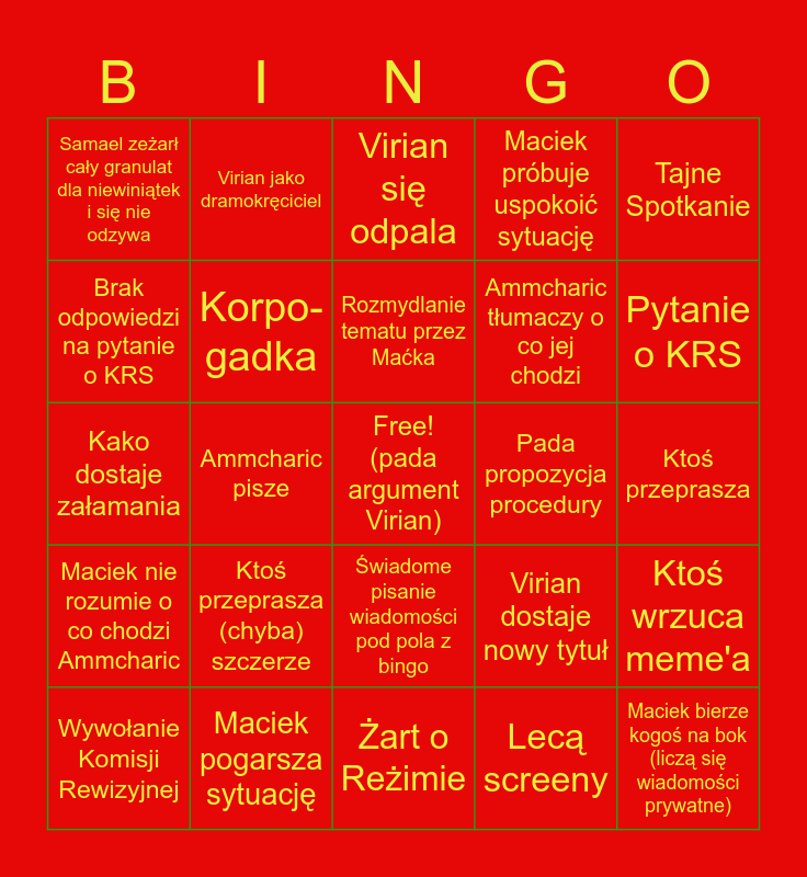 This bingo card has a free space and 28 words: Ktoś wrzuca meme'a, Komisja broni zarządu, Ammcharic tłumaczy o co jej chodzi, Lecą screeny, Brak odpowiedzi na pytanie o KRS, Virian się odpala, Virian jako dramokręciciel, Maciek nie rozumie o co chodzi Ammcharic, Pada propozycja procedury, Wywołanie Komisji Rewizyjnej, Kako dostaje załamania, Maciek próbuje uspokoić sytuację, Maciek pogarsza sytuację, Żart o Reżimie, Pytanie o KRS, Komisja zmusza kogoś do przeprosin, Ktoś przeprasza (chyba) szczerze, Korpo-gadka, Rozmydlanie tematu przez Maćka, Świadome pisanie wiadomości pod pola z bingo, Samael zeżarł cały granulat dla niewiniątek i się nie odzywa, Skarga do rewizyjnej, Maciek bierze kogoś na bok (liczą się wiadomości prywatne), Ammcharic pisze, Ktoś przeprasza, Virian dostaje nowy tytuł, Tajne Spotkanie and Zeznania się nie kleją.