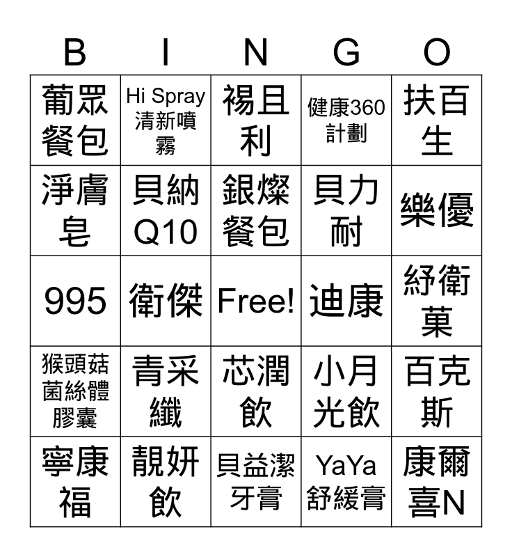 This bingo card has a free space and 43 words: 995, 995, 永生福朗, 樟芝益, 康爾喜, 康爾喜N, 葡眾餐包, 原味餐包, 銀燦餐包, 小月光飲, 樂優, 猴頭菇菌絲體膠囊, 衛傑, 禾玥, 艾逸, 百克斯, 康貝寧, 貝納Q10, 清明亮, 貝力耐, 扶百生, 醣利佳, 青采纖, 裼且利, 康侻兒, 紓衛菓, 康爾𣈱, 康爾動, 欣悅康, 迪康, 力盛, 寧康福, 靚妍飲, 芯潤飲, YaYa舒緩膏, Hi Kiss洗面乳, 蘆露蘆薈膠, Hi Spray清新噴霧, 貝益潔牙膏, 健康360計劃, 奇芮愛犬益生菌, 淨膚皂 and 蟬花護手霜.