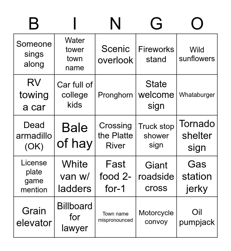 This bingo card has a free space and 24 words: White van w/ ladders, Billboard for lawyer, Pronghorn, Grain elevator, Wild sunflowers, Someone sings along, RV towing a car, Water tower town name, Truck stop shower sign, Fast food 2-for-1, State welcome sign, Dead armadillo (OK), Giant roadside cross, Gas station jerky, Car full of college kids, Motorcycle convoy, Tornado shelter sign, Scenic overlook, Whataburger, Bale of hay, Oil pumpjack, License plate game mention, Fireworks stand and Town name mispronounced.
