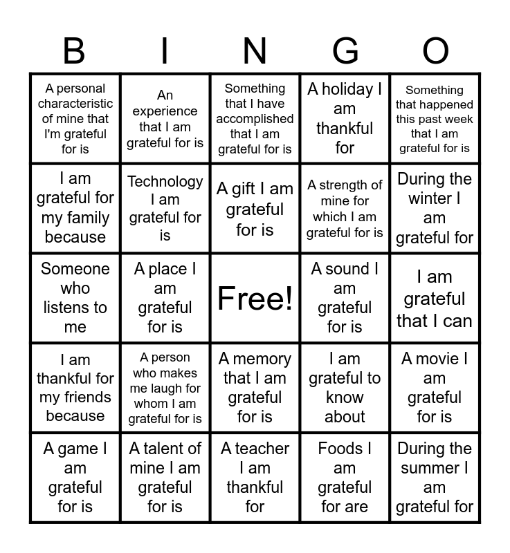 This bingo card has a free space and 24 words: A person who makes me laugh for whom I am grateful for is, A talent of mine I am grateful for is, A gift I am grateful for is, A game I am grateful for is, Something that happened this past week that I am grateful for is, A personal characteristic of mine that I'm grateful for is, I am grateful for my family because, An experience that I am grateful for is, A sound I am grateful for is, A memory that I am grateful for is, A strength of mine for which I am grateful for is, Someone who listens to me, I am grateful to know about, A movie I am grateful for is, Technology I am grateful for is, Foods I am grateful for are, I am grateful that I can, Something that I have accomplished that I am grateful for is, During the winter I am grateful for, A place I am grateful for is, During the summer I am grateful for, I am thankful for my friends because, A holiday I am thankful for and A teacher I am thankful for.