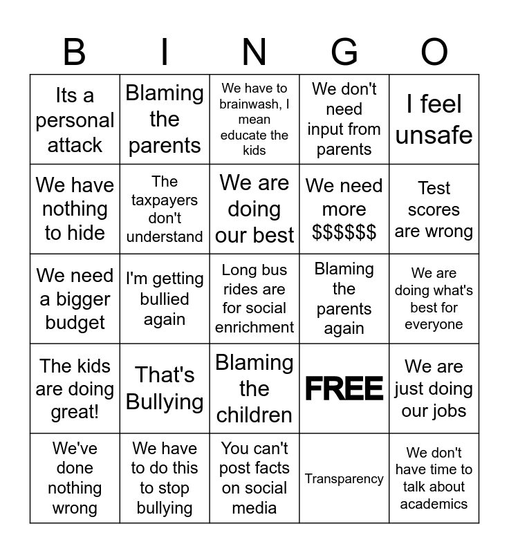 This bingo card has 25 words: That's Bullying, You can't post facts on social media, We are doing our best, We've done nothing wrong, I feel unsafe, Its a personal attack, We have nothing to hide, Blaming the parents, Blaming the parents again, Blaming the children, We need more $$$$$$, We need a bigger budget, FREE, We are just doing our jobs, The taxpayers don't understand, We don't have time to talk about academics, We are doing what's best for everyone, We have to brainwash, I mean educate the kids, Test scores are wrong, I'm getting bullied again, Long bus rides are for social enrichment, We have to do this to stop bullying, The kids are doing great!, We don't need input from parents and Transparency.