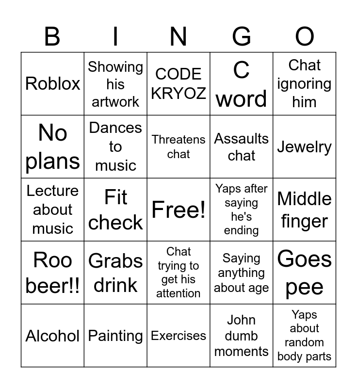 This bingo card has a free space and 24 words: Grabs drink, Painting, Threatens chat, Alcohol, Chat ignoring him, Roblox, No plans, Showing his artwork, Yaps after saying he's ending, Chat trying to get his attention, Assaults chat, Lecture about music, Saying anything about age, Goes pee, Dances to music, John dumb moments, Middle finger, CODE KRYOZ, Jewelry, Fit check, Yaps about random body parts, Roo beer!!, C word and Exercises.