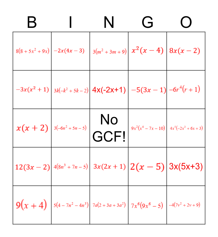 This bingo card has 26 images, a free space and 3 words: 3x(5x+3), 4x(-2x+1) and 6(2x+1).