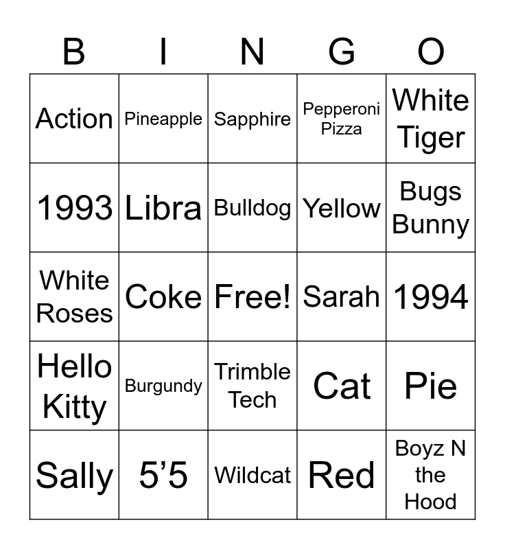 This bingo card has a free space and 40 words: Blue, White Roses, 1975, Libra, 5’5, Trimble Tech, Bulldog, Cowboys, White Tiger, Hello Kitty, Coke, Pepperoni Pizza, Boyz N the Hood, 1994, Sarah, Burgundy, Lemon, Action, Cake, Sapphire, Pie, Red, Yellow, 1993, 1974, Lily, Virgo, 5’5, Poly High School, Sprite, Love and Basketball, Sally, Tiger, Cat, Bugs Bunny, Wildcat, Steelers, Mexican food, Pineapple and Horror.