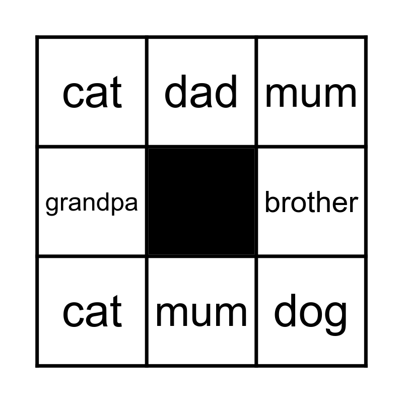 This bingo card has a free space and 11 words: sister, mum, dog, cat, dad, mum, brother, grandpa, grandpa, cat and mum.
