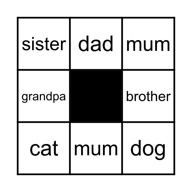 This bingo card has a free space and 11 words: sister, mum, dog, cat, dad, mum, brother, grandpa, grandpa, sister and mum.
