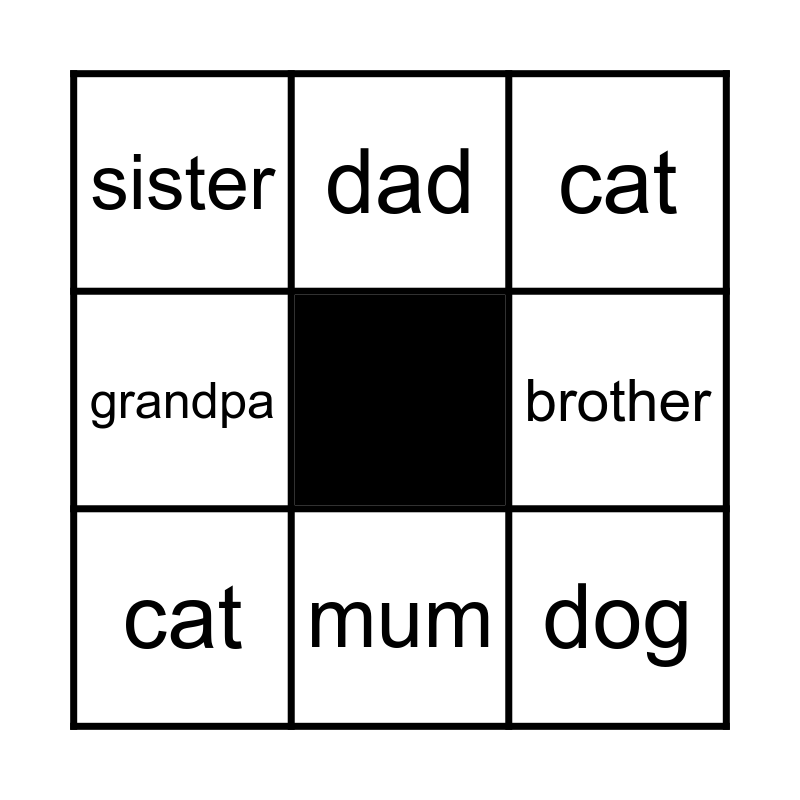 This bingo card has a free space and 11 words: sister, mum, dog, cat, dad, cat, brother, grandpa, grandpa, sister and mum.