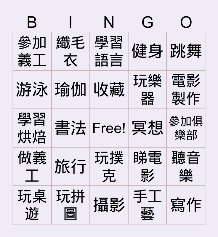 This bingo card has a free space and 50 words: 閱讀, 寫作, 繪畫, 攝影, 旅行, 烹飪, 織毛衣, 跑步, 游泳, 單車, 瑜伽, 健身, 聽音樂, 睇電影, 玩遊戲, 園藝, 收藏, 冥想, 遠足, 跳舞, 書法, 手工藝, 參加義工, 玩樂器, 睇書, 聊天, 電影製作, 繪漫畫, 學習語言, 玩撲克, 做運動, 參觀博物館, 睇戲, 釣魚, 玩拼圖, 參加聚會, 做陶藝, 養寵物, 玩電子遊戲, 參加俱樂部, 養魚, 參加舞蹈班, 製作手工藝品, 參加攝影班, 玩桌遊, 學習烘焙, 參加藝術課程, 參加文化活動, 做義工 and 學習編程.