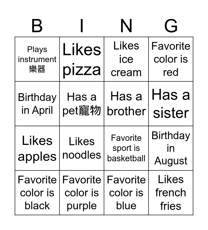 This bingo card has 16 words: Favorite color is purple, Birthday in August, Likes ice cream, Plays instrument 樂器, Likes apples, Likes pizza, Favorite sport is basketball, Favorite color is blue, Birthday in April, Has a pet寵物, Favorite color is black, Favorite color is red, Likes noodles, Has a sister, Has a brother and Likes french fries.