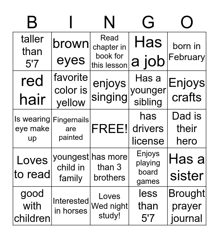 This bingo card has a free space and 24 words: youngest child in family, Interested in horses, enjoys singing, good with children, born in February, taller than 5'7, red hair, brown eyes, has drivers license, has more than 3 brothers, Has a younger sibling, Is wearing eye make up, Enjoys playing board games, Has a sister, favorite color is yellow, less than 5'7, Dad is their hero, Read chapter in book for this lesson, Enjoys crafts, Fingernails are painted, Brought prayer journal, Loves to read, Has a job and Loves Wed night study!.