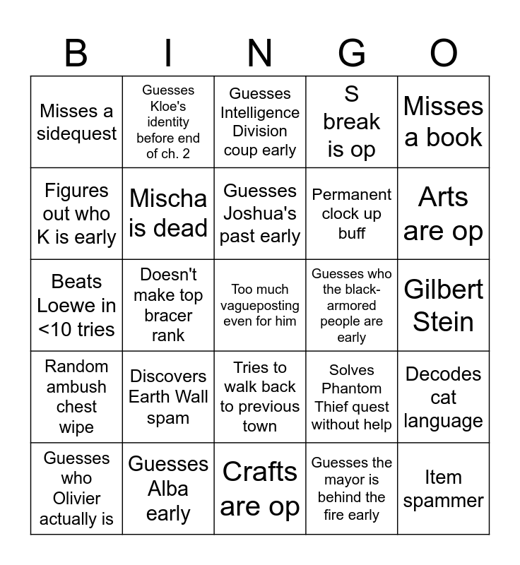 This bingo card has a free space and 24 words: Discovers Earth Wall spam, Guesses Alba early, Guesses Joshua's past early, Guesses who Olivier actually is, Misses a book, Misses a sidequest, Figures out who K is early, Guesses Kloe's identity before end of ch. 2, Guesses who the black-armored people are early, Tries to walk back to previous town, Permanent clock up buff, Beats Loewe in <10 tries, Solves Phantom Thief quest without help, Decodes cat language, Mischa is dead, Guesses the mayor is behind the fire early, Gilbert Stein, Guesses Intelligence Division coup early, Arts are op, Doesn't make top bracer rank, Item spammer, Random ambush chest wipe, S break is op and Crafts are op.