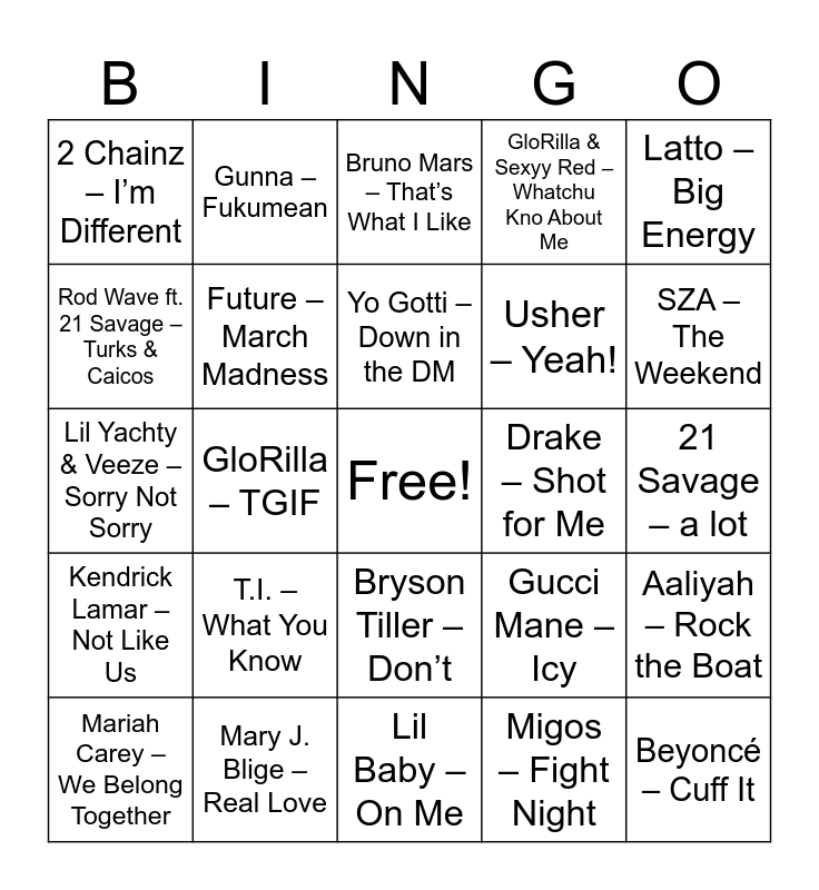 This bingo card has a free space and 33 words: Chris Brown – It Depends, Rod Wave – Heart on Ice, GloRilla – TGIF, Rihanna ft. Future – Loveeeeeee Song, Kendrick Lamar – Not Like Us, Future – March Madness, Latto – Big Energy, Mariah Carey – We Belong Together, Gunna – Fukumean, Tyga – Rack City, Yo Gotti – Down in the DM, Bruno Mars – That’s What I Like, Beyoncé – Drunk in Love, Rihanna – Work, Drake – Shot for Me, SZA – The Weekend, Mary J. Blige – Real Love, Lil Yachty & Veeze – Sorry Not Sorry, T.I. – What You Know, Gucci Mane – Icy, Bryson Tiller – Don’t, Doja Cat – Say So, 2 Chainz – I’m Different, 21 Savage – a lot, Lil Baby – On Me, Beyoncé – Cuff It, GloRilla & Sexyy Red – Whatchu Kno About Me, Usher – Yeah!, Rod Wave ft. 21 Savage – Turks & Caicos, Aaliyah – Rock the Boat, Ice Spice – Munch, Migos – Fight Night and Chris Brown – No Guidance.