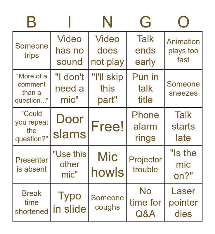 This bingo card has a free space and 28 words: "Is the mic on?", Applause in the next room, Pun in talk title, No time for Q&A, "More of a comment than a question...", Video does not play, Video has no sound, Presenter is absent, Phone alarm rings, Break time shortened, "Could you repeat the question?", Talk ends early, Typo in slide, Someone coughs, Someone sneezes, Loud chatting during talk, "Use this other mic", "I don't need a mic", "I'll skip this part", Mic howls, Someone trips, "I missed the start of the talk, but...", Laser pointer dies, Door slams, Talk starts late, Projector trouble, Animation plays too fast and Sleeping audience member.