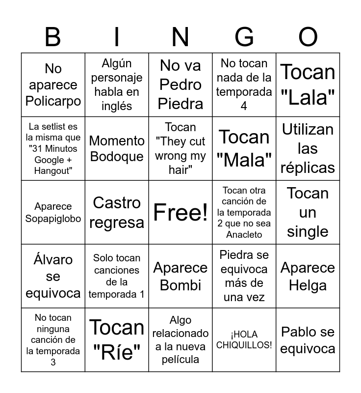 This bingo card has a free space and 29 words: No tocan ninguna canción de la temporada 3, No va Peirano, Castro regresa, Tocan "Me cortaron mal el pelo", No aparece Policarpo, No va Pedro Piedra, Momento Bodoque, Solo tocan canciones de la temporada 1, Tocan otra canción de la temporada 2 que no sea Anacleto, Tocan "Ríe", Tocan un single, Pablo se equivoca, Algo relacionado a la nueva película, ¡HOLA CHIQUILLOS!, Utilizan las réplicas, Marcelo Wilson sigue siendo el tecladista, Aparece Bombi, Álvaro se equivoca, Tocan "Lala", Aparece Sopapiglobo, Piedra se equivoca más de una vez, Tocan YNVTV sin el arreglo triste, Tocan "Mala", La setlist es la misma que "31 Minutos Google + Hangout", No tocan nada de la temporada 4, Algún personaje habla en inglés, Aparece Helga, Tocan "They cut wrong my hair" and Tocan "Diente Blanco" sin arreglos adicionales.