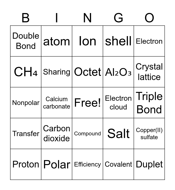 This bingo card has a free space and 34 words: Ionic, Covalent, Ozone, Bond, Transfer, Sharing, Electron, Proton, atom, Valence, Octet, Ion, Cation, Anion, Electron cloud, Crystal lattice, Polar, Nonpolar, Carbon dioxide, Salt, Compound, Stability, Double Bond, Triple Bond, Efficiency, Duplet, shell, periodic table, Al₂O₃, CH₄, CaCl₂, Calcium carbonate, Copper(II) sulfate and Zinc chloride.