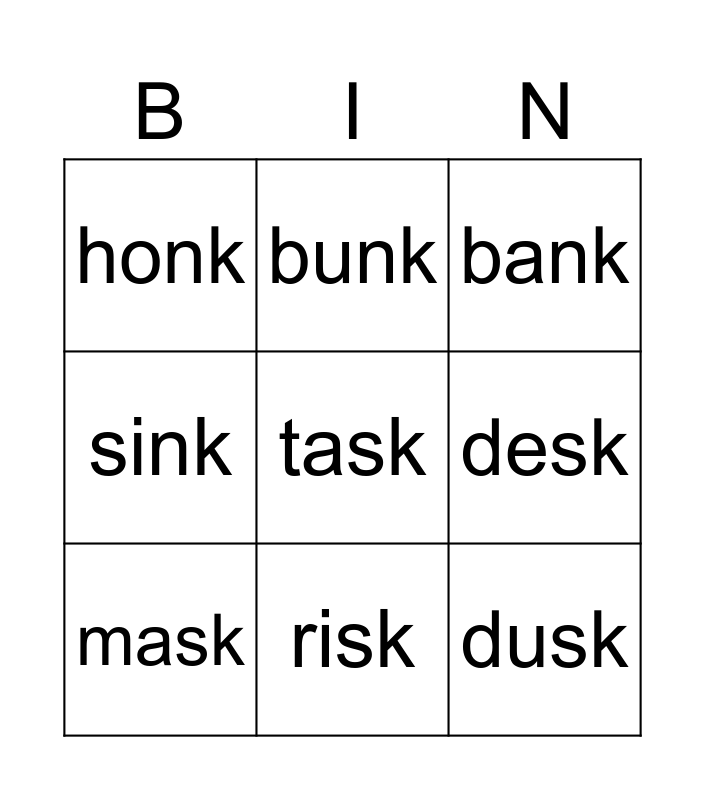 This bingo card has a free space and 8 words: desk, bank, bunk, mask, honk, dusk, sink and risk.