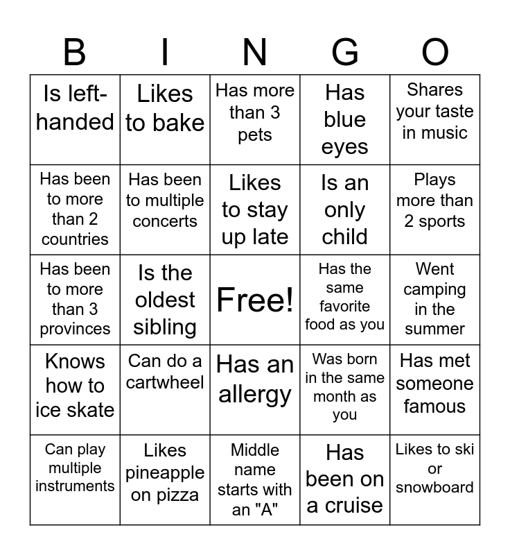 This bingo card has a free space and 24 words: Can do a cartwheel, Likes pineapple on pizza, Likes to stay up late, Can play multiple instruments, Shares your taste in music, Is left-handed, Has been to more than 2 countries, Likes to bake, Has the same favorite food as you, Has an allergy, Is an only child, Has been to more than 3 provinces, Was born in the same month as you, Has met someone famous, Has been to multiple concerts, Has been on a cruise, Went camping in the summer, Has more than 3 pets, Plays more than 2 sports, Is the oldest sibling, Likes to ski or snowboard, Knows how to ice skate, Has blue eyes and Middle name starts with an "A".