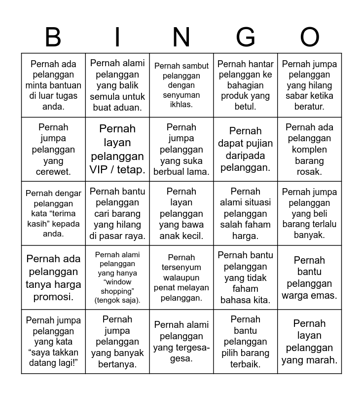 This bingo card has a free space and 24 words: Pernah jumpa pelanggan yang kata “saya takkan datang lagi!”, Pernah alami pelanggan yang hanya “window shopping” (tengok saja)., Pernah jumpa pelanggan yang suka berbual lama., Pernah bantu pelanggan pilih barang terbaik., Pernah jumpa pelanggan yang hilang sabar ketika beratur., Pernah ada pelanggan minta bantuan di luar tugas anda., Pernah alami pelanggan yang balik semula untuk buat aduan., Pernah sambut pelanggan dengan senyuman ikhlas., Pernah alami situasi pelanggan salah faham harga., Pernah jumpa pelanggan yang beli barang terlalu banyak., Pernah dengar pelanggan kata “terima kasih” kepada anda., Pernah layan pelanggan VIP / tetap., Pernah bantu pelanggan yang tidak faham bahasa kita., Pernah bantu pelanggan warga emas., Pernah jumpa pelanggan yang cerewet., Pernah jumpa pelanggan yang banyak bertanya., Pernah alami pelanggan yang tergesa-gesa., Pernah hantar pelanggan ke bahagian produk yang betul., Pernah ada pelanggan komplen barang rosak., Pernah ada pelanggan tanya harga promosi., Pernah bantu pelanggan cari barang yang hilang di pasar raya., Pernah tersenyum walaupun penat melayan pelanggan., Pernah dapat pujian daripada pelanggan. and Pernah layan pelanggan yang marah..