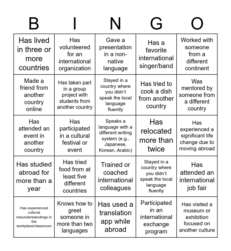This bingo card has a free space and 24 words: Has tried food from at least five different countries, Knows how to greet someone in more than two languages, Stayed in a country where you didn’t speak the local language fluently, Has experienced cultural misunderstandings in the workplace/classroom, Worked with someone from a different continent, Has lived in three or more countries, Made a friend from another country online, Has volunteered for an international organization, Has relocated more than twice, Trained or coached international colleagues, Has tried to cook a dish from another country, Has attended an event in another country, Stayed in a country where you didn’t speak the local language fluently, Has attended an international job fair, Has taken part in a group project with students from another country, Participated in an international exchange program, Has experienced a significant life change due to moving abroad, Gave a presentation in a non-native language, Was mentored by someone from a different country, Has participated in a cultural festival or event, Has visited a museum or exhibition focused on another culture, Has studied abroad for more than a year, Has a favorite international singer/band and Has used a translation app while abroad.