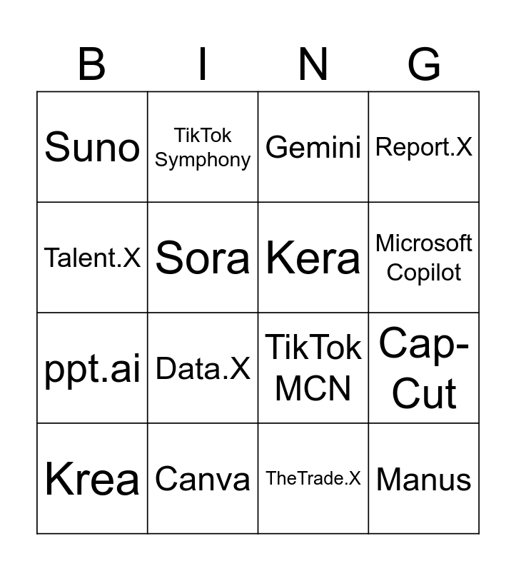 This bingo card has 16 words: Canva, Cap-Cut, Gemini, Suno, ppt.ai, TikTok Symphony, TikTok MCN, TheTrade.X, Talent.X, Sora, Krea, Report.X, Data.X, Microsoft Copilot, Kera and Manus.