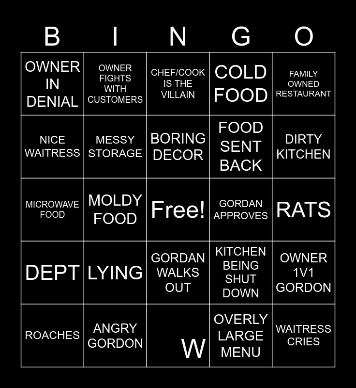This bingo card has a free space and 24 words: LYING, ANGRY GORDON, BORING DECOR, ROACHES, FAMILY OWNED RESTAURANT, OWNER IN DENIAL, NICE WAITRESS, OWNER FIGHTS WITH CUSTOMERS, GORDAN APPROVES, GORDAN WALKS OUT, FOOD SENT BACK, MICROWAVE FOOD, KITCHEN BEING SHUT DOWN, OWNER 1V1 GORDON, MESSY STORAGE, OVERLY LARGE MENU, RATS, CHEF/COOK IS THE VILLAIN, DIRTY KITCHEN, MOLDY FOOD, WAITRESS CRIES, DEPT, COLD FOOD and W.
