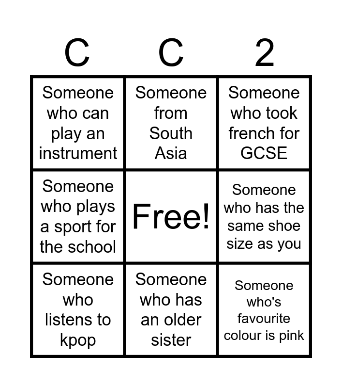 This bingo card has a free space and 17 words: Someone who's fav subject is maths, Someone who can speak a different language, Someone who took french for GCSE, Someone who can play an instrument, Someone who likes anime, Someone who plays a sport for the school, Someone who likes anime, Someone who listens to kpop, Someone who has an older sister, Someone who has the same shoe size as you, Someone who has a younger brother, Someone who's been to more than five countries, Someone who's favourite colour is pink, Someone from South Asia, Someone from 2 different countries, Someone who likes musicals and Someone who knows who the 1st president of America was.