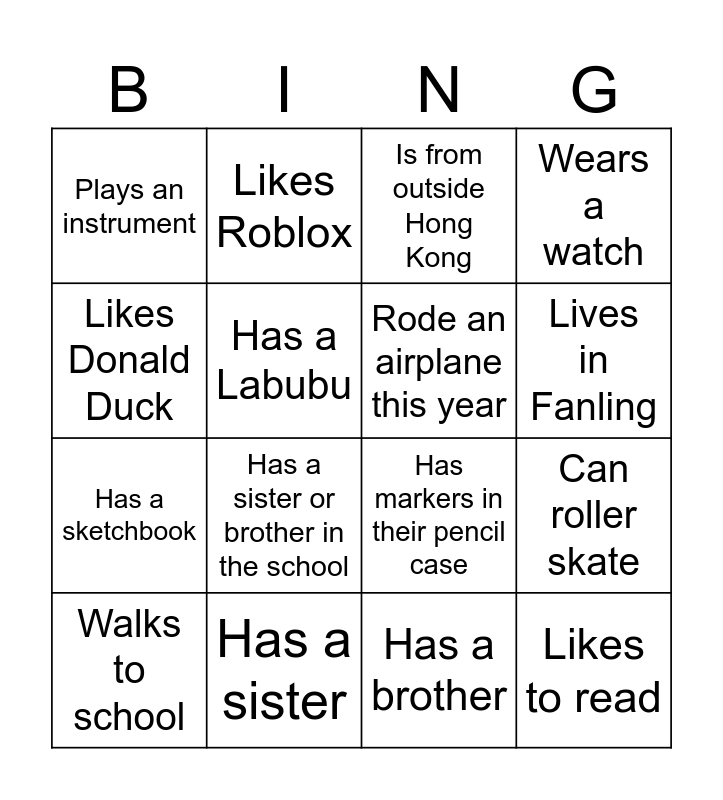 This bingo card has 16 words: Has a sister, Can roller skate, Is from outside Hong Kong, Plays an instrument, Has a sketchbook, Likes Roblox, Has markers in their pencil case, Has a brother, Likes Donald Duck, Has a Labubu, Walks to school, Wears a watch, Has a sister or brother in the school, Lives in Fanling, Rode an airplane this year and Likes to read.