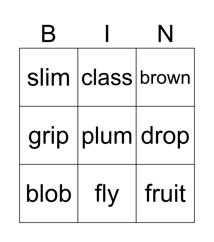 This bingo card has 9 words: blob, brown, class, grip, slim, drop, plum, fruit and fly.