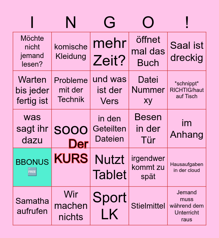 This bingo card has 55 words: Dafooooooooohn, Samatha aufrufen, Gruppenarbeit, Möchte nicht jemand lesen?, Sport LK, Sich auf den Tisch setzten, Probleme mit der Technik, Nischd, Datei Nummer xy, Das ist aber laut da draußen, öffnet mal das Buch, das Schicke ich euch noch, 🆓, Ähmmmm, 5er Bemerkung, mit Lilly diskutieren, Saal ist dreckig, sooo, öffnet mal das Buch, in den Geteilten Dateien, Besen in der Tür, Lukas yeppt, irgendwer kommt zu spät, mehr Zeit?, Arbeitsteilung, und was ist der Vers, Stielmittel, wir verstehen mal wieder nichts, im Anhang, Hausaufgaben in der cloud, Sophia hat das Buch dabei, Sophia hat das Buch nicht dabei, Basti hat das Buch, Basti hat kein Buch, Warten bis jeder fertig ist, was sagt ihr dazu, LKW piept, BBONUS 🆓, Jemand muss während dem Unterricht raus, in der Cloud, komische Kleidung, Grotesk, Der andere schreibt wie viele Minutennoch übrig sind, Gud, Der KURS, Wir machen nichts, hakvgdfhsl Oder. So Von dem anderen, Montags Bonus 🆓, Donnerstags Bonus 🆓, *schnippt* RICHTIG/haut auf Tisch, Ihr erinnert euch, Erinnerten uns nicht mehr, Ahhh, Nutzt Tablet and Vergisst Freze.
